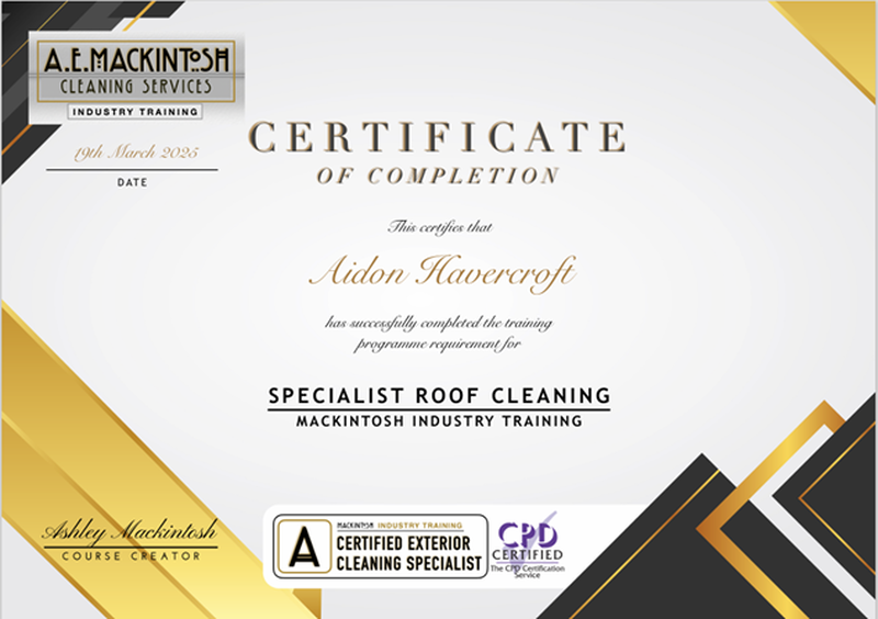 We offer a specialised low pressure roof cleaning service with a biocide treatment to kill off organic growth. The treatment is applied and will stay active for 18 months and is a non-corrosive chemical. The treatment prevents any organic growth from coming back for 2 years based on a maintenance plan and depending on environmental factors. This chemical will not attack anything that is not organic so no need to worry. We have been in the pressure washing industry for 9 years and gained a variety of experience. Our company takes pride knowing we are fully insured and trained in roof cleaning. This certification is certified by CPD which is accredited and recognised in the United Kindom and Europe. Roof cleaning can be a messy job, but rest assured we will clean any mess and all area will be rinsed down. With every roof clean we offer free gutter clearing services and inspection.